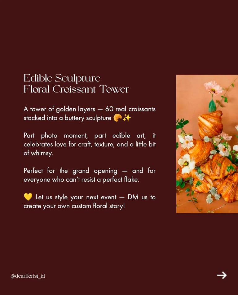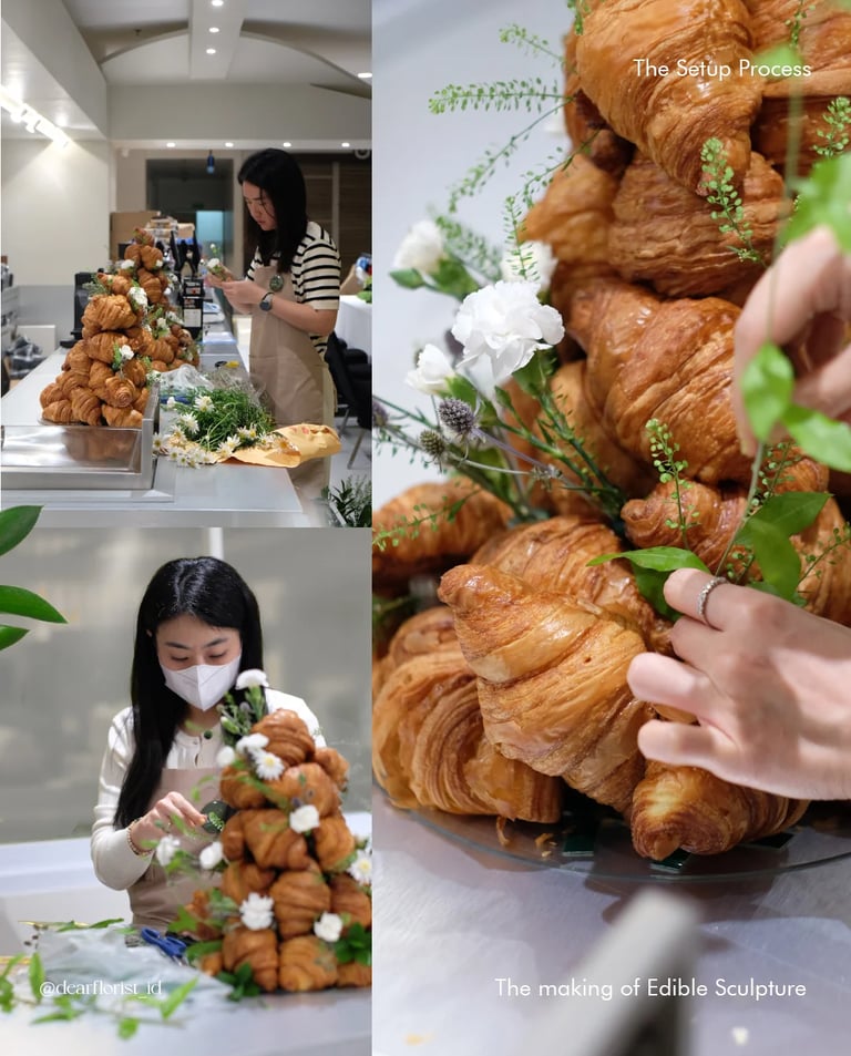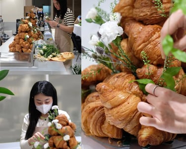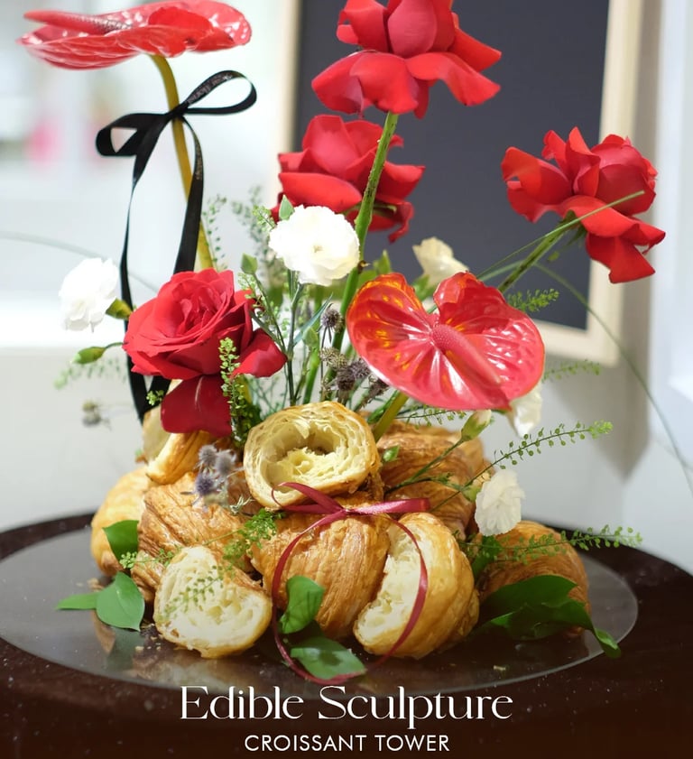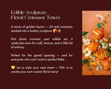 A tower of golden layers — 60 real croissants stacked into a buttery "Edible Sculpture. It celebrates Morsure’s love for craft, texture, and a little touch of whimsy. Where edible meets botanical, and every detail tells a story. 🌸