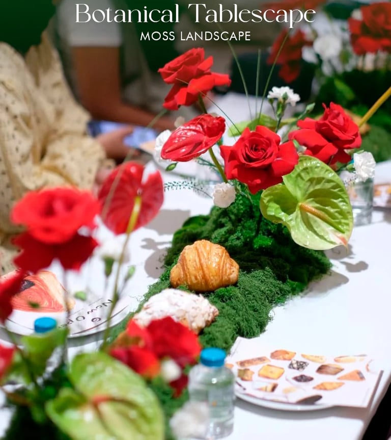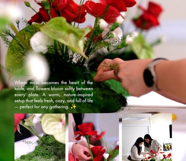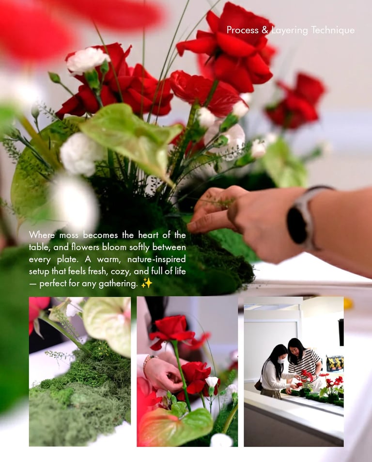 We created a floral narrative composed through layers of texture, light, and color — a story we call “Botanical Tablescape.” 🌿✨Every detail, from the moss base to the curve of each rose, blends flavor and florals into perfect harmony.