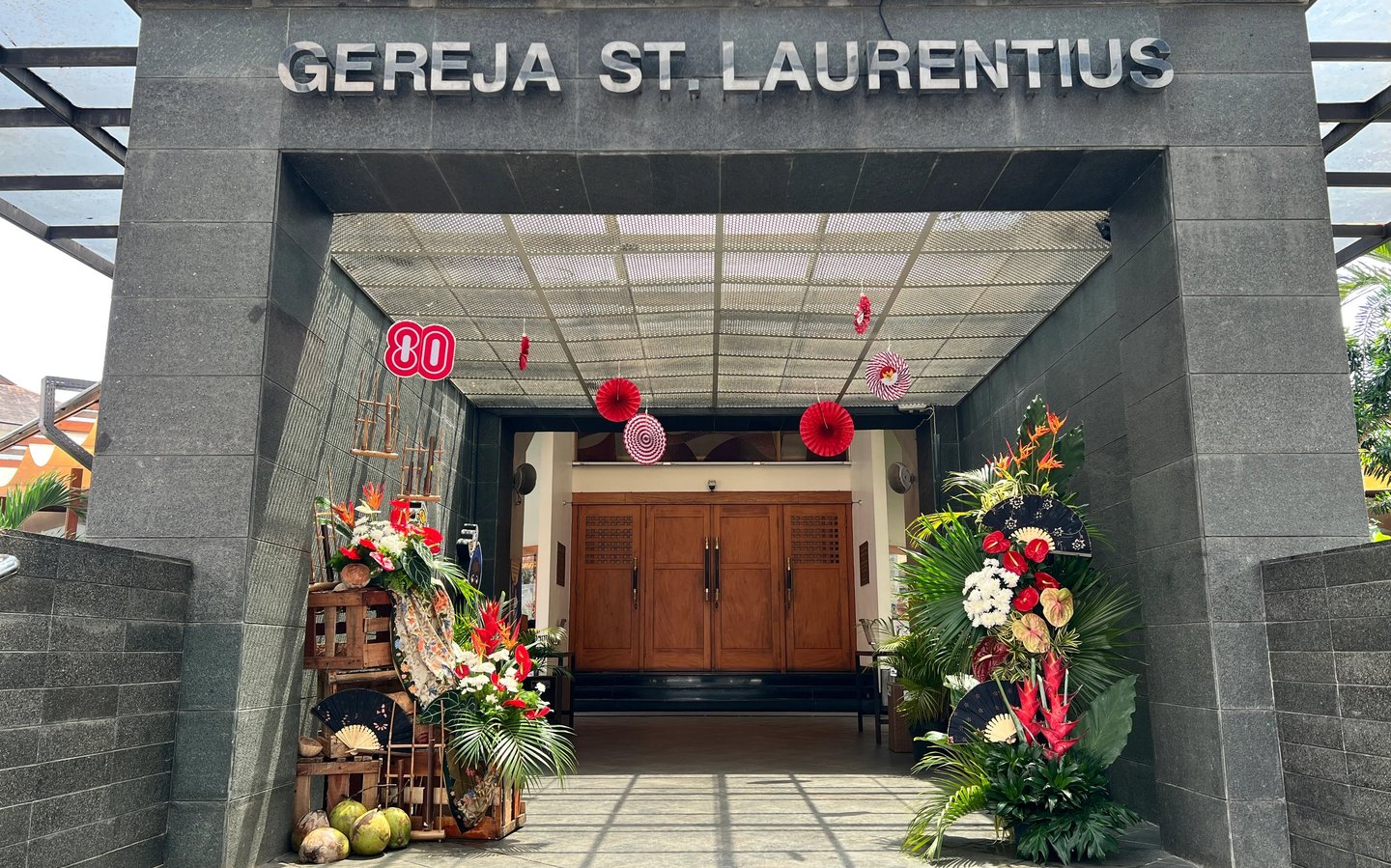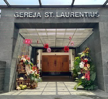 To celebrate Indonesian Independence Day, Dearflorist collaborated with the church’s florist community, Florentina, to style the main hallway of St. Laurentius Church with a festive yet respectful atmosphere. The entrance was transformed into a welcoming passage that honored the spirit of Merdeka while remaining aligned with the sacred character of the church.
